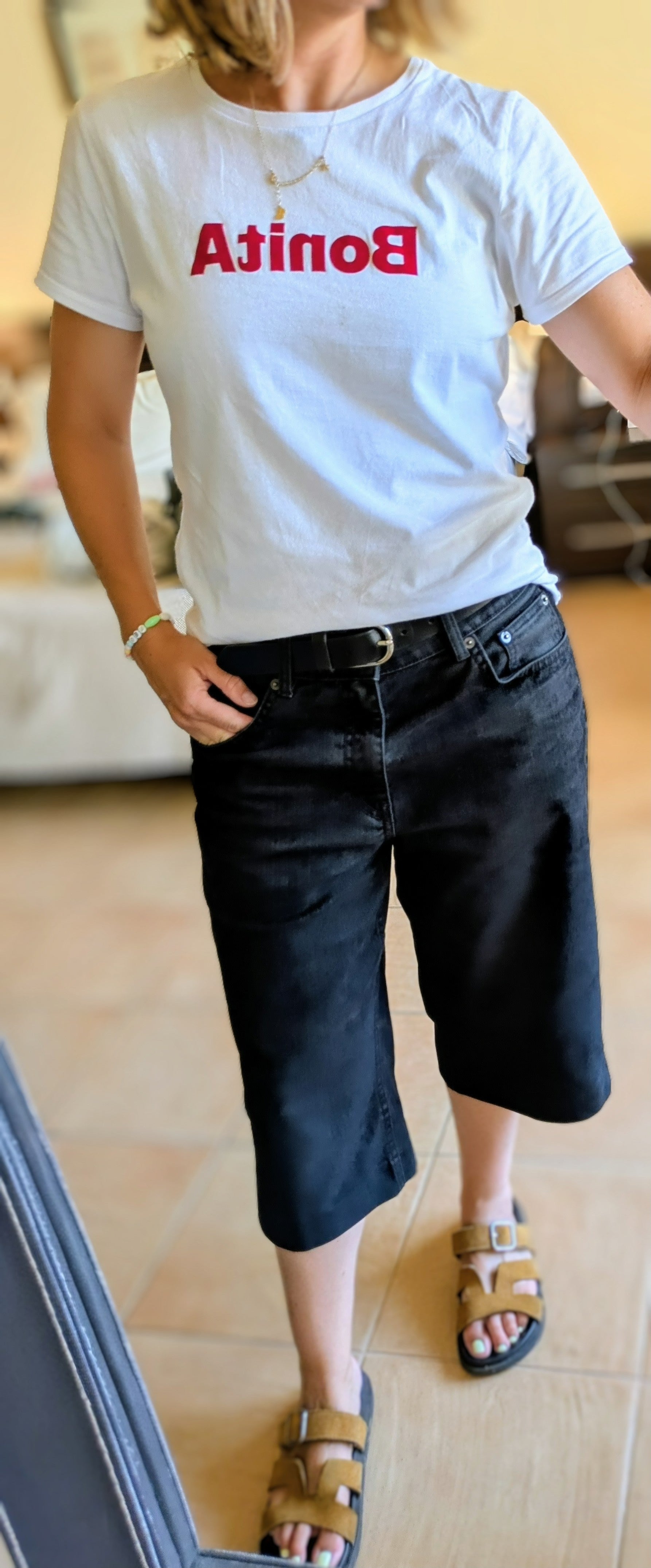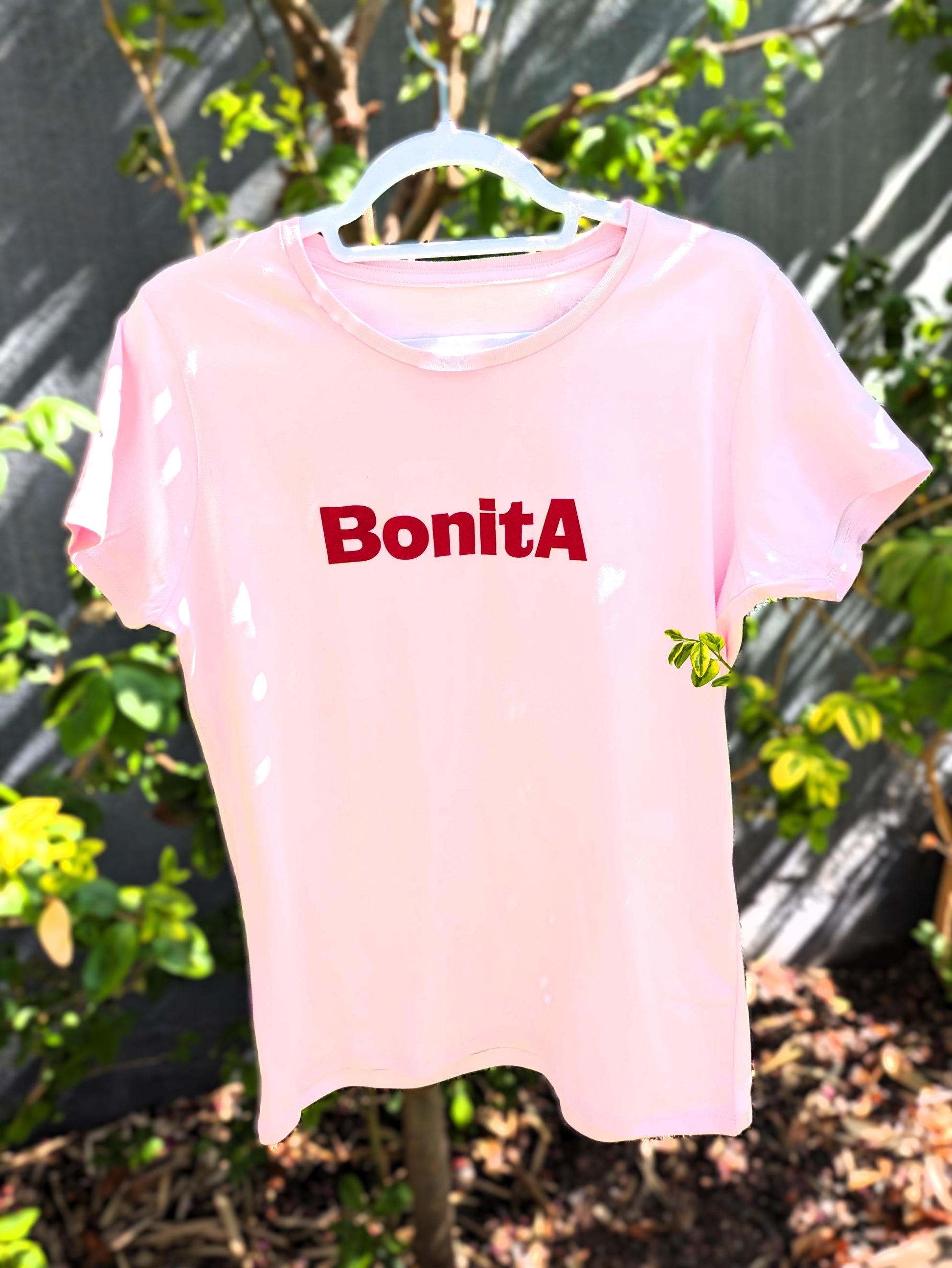 Camiseta de manga corta entallada, con ribete de 0,5 cm en el cuello. Nombre de BONITA en la parte delantera de color rojo y tela de ante. Si dudas entre dos tallas coge la más grande.